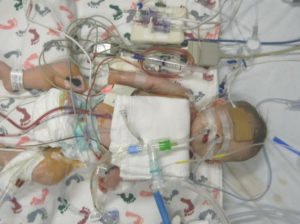 Benedict “Ben” was delivered full-term by C-section in September 2012. By age 4 months he had undergone three open-heart surgeries common with Down Syndrome: Correction of the aorta repair at five days old, complete atrial-ventricular septal defect repair in December 2012, and mitral valve repair in January 2013. At one month, Ben began to have a series of respiratory infections, which required a long-term hospitalization and reinforced his need for a placement of a G-tube.