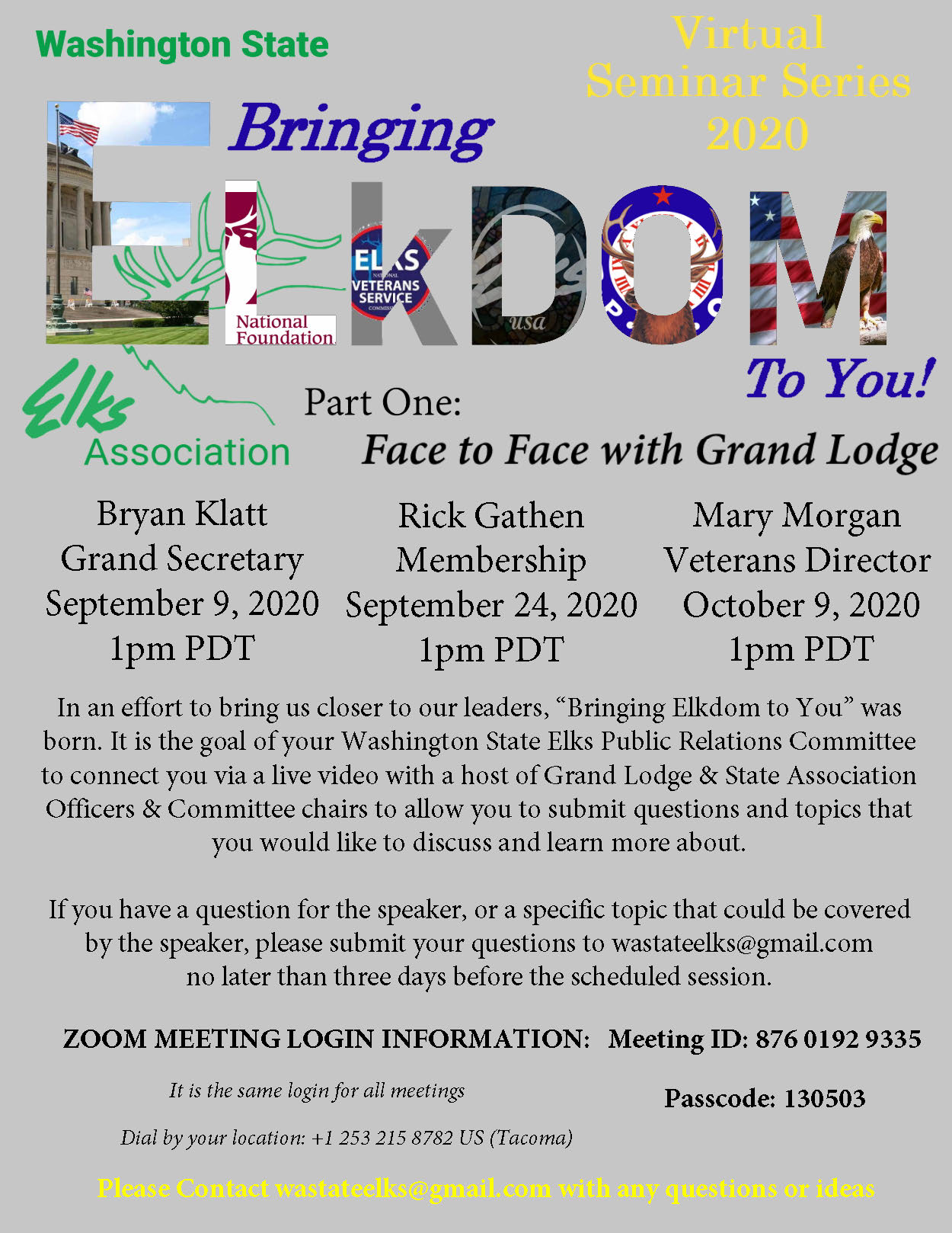 In an effort to bring us closer to our leaders, “Bringing Elkdom to You” was born. It is the goal of your Washington State Elks Public Relations Committee to connect you via a live video with a host of Grand Lodge & State Association Officers & Committee chairs to allow you to submit questions and topics that you would like to discuss and learn more about.