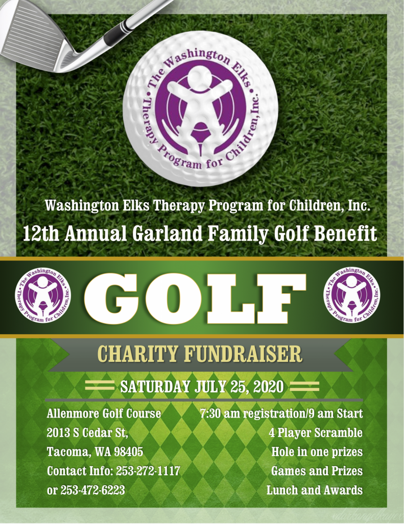The 12th Annual Garland Family Golf Benefit Charity Fundraiser will take place on Saturday, July 25, 2020. The Golf fundraiser will be a four-person Scramble. Two golf carts will be provided for each foursome. Raffle Tickets and Mulligans will be available for purchase at the event. We encourage the opportunity to make new friends and raise money for our State Major Project, The Washington Elks Therapy Program for Children Inc.
