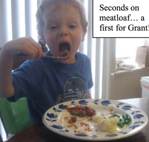 Today at 4½, Grant is willing to try new foods most of the time. He will even try the sample items at Costco! He will stall if he thinks he won’t like it, but he will eventually eat it. He certainly still has his favorite foods, but this list has grown. His challenge foods at this point are mixed texture casserole type dishes and sauces. Ketchup, however, has been designated its own food group on the food pyramid, and one he likes a great deal. Grant is getting protein along with fruits and vegetables in his diet. Sec