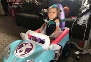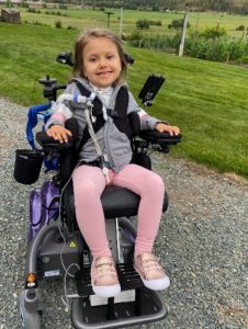 Kenzie has learned to paint using a paintbrush attached to a headband. She is also learning to drive her power wheelchair by moving her head. Kenzie is able to use eye-gaze software to do activities on a computer. During OT sessions Kenzie works to actively move her shoulder muscles while playing games and making crafts. Kenzie’s family members, nurses and therapist work to keep her body moving and her mind engaged.