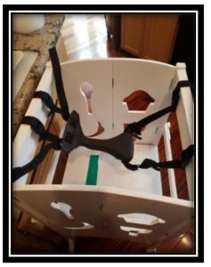 Enter Elks Therapy. Moira’s occupational therapist adapted her Kitchen Helper step stool with a seat from another piece of adapted equipment that was not in use. This seat allows Moira to stand when she wants to, and sit when she tires or when she needs to use both hands for mixing pancake batter or cutting out cookies. The seat easily detaches so the stepstool can be folded and stored when not in use.