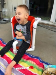 During therapy, Pierce works on rolling over, trying to master a commando crawl to get his toys, and reaching out to knock down a tower of blocks; because blocks are noisy when they fall, making it all the more rewarding! All of these tasks are extremely difficult for him. Pierce relies on external support to sit on the floor, be it his bucket chair (made by Dad) or a lap.