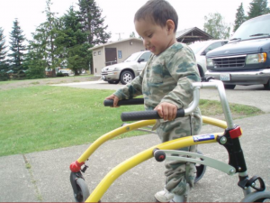 Meet Sebastian who is now three years old. He was referred to the Elks Therapy Program when he was five months old. He had undergone spinal cord surgery and was still recovering. Sebastian was born with spina bifida. Spina bifida is a birth defect that disrupts the normal formation of the spinal cord. The nerves and muscles of his legs are affected. He has some movement in his hips and upper legs but is flaccid below the knee. Sebastian is a very spirited young fellow and determined to keep up with his sister and classmates. He loves to climb and go down the slide. In therapy we have worked to strengthen his legs and develop his balance. A tricycle was adapted so his feet could stay on the pedals and he could strengthen his legs while having fun. Until recently crawling was his primary method of getting around. He was unable to place his feet flat on the floor to allow for bearing weight and stepping. With the help of an orthotist we were able to make him special braces to help with his foot alignment. He has made amazing progress and, with the help of a walker, he is now walking! AND very proud of himself!