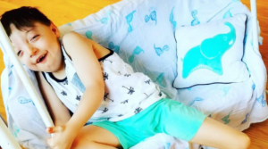 His insurance will not cover therapies—so his Elks Therapy has continued to be critical to his development. Skylar remains “undiagnosed”, meaning there is no known cause for all of his delays, which also means there is no “road map” for planning his care, or knowing what his longer-term needs or goals may be. His medical team has now discovered that he has both seizures as well as sleep apnea, but as those are now being treated, Skylar is growing and thriving! He has grown several inches and put on a lot of needed weight over the past year. He continues to outgrow his medical equipment both in size and skill just about as quickly as it can be ordered for him, so sometimes the creativity of his Elks therapist is needed to adapt regular objects & equipment for him, and keep pace with his needs. He loves his “off the shelf” swing to provide great movement experiences, as well as a safe place to rest or practice sitting balance.